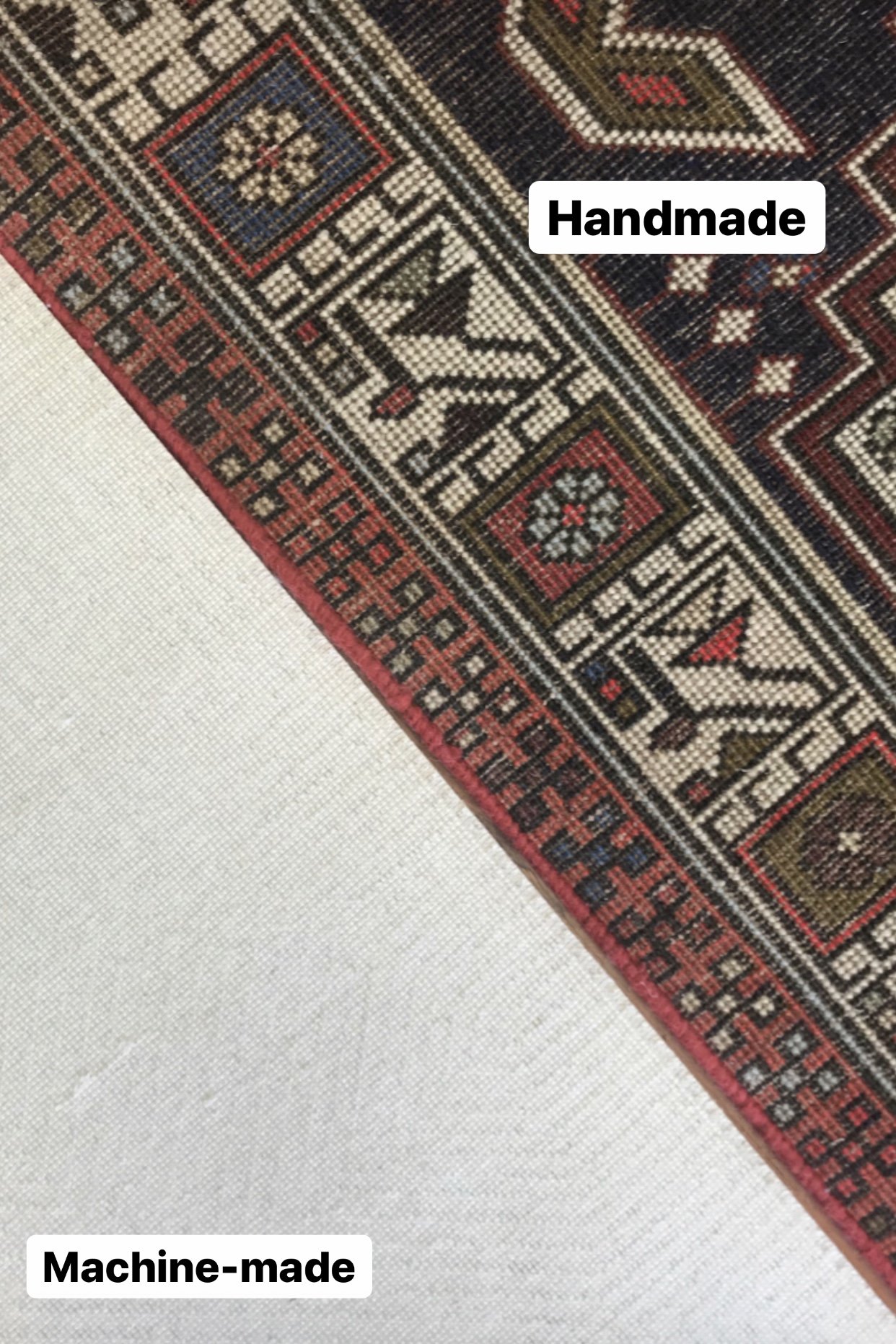 Comparing the back of a handmade vs machine-made rug.